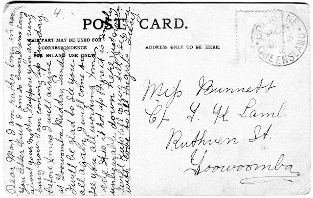 It is very similar to Brisbane Type 21 but with 'POB' instead of a time code. It is not known why 'POB' was inserted in some of the type 21 date stamps or what it signified. It is possible that it is similar to the usage found in the type 14 Pillarbox octagonal date stamps, where POB means posted overseas box. However examples have been seen sent within Brisbane, Queensland, interstate and overseas. Known used from 30 June 1906 to 7 November 1908. Often the year is missing. Rated Common on stamp and 2R on cover.