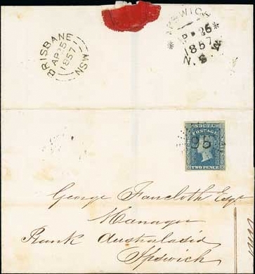 Brisbane datestamp type NSW 3. Dated 8 September 1857. Rated common. Seen in Spink auction no 12043 lot no 1009
